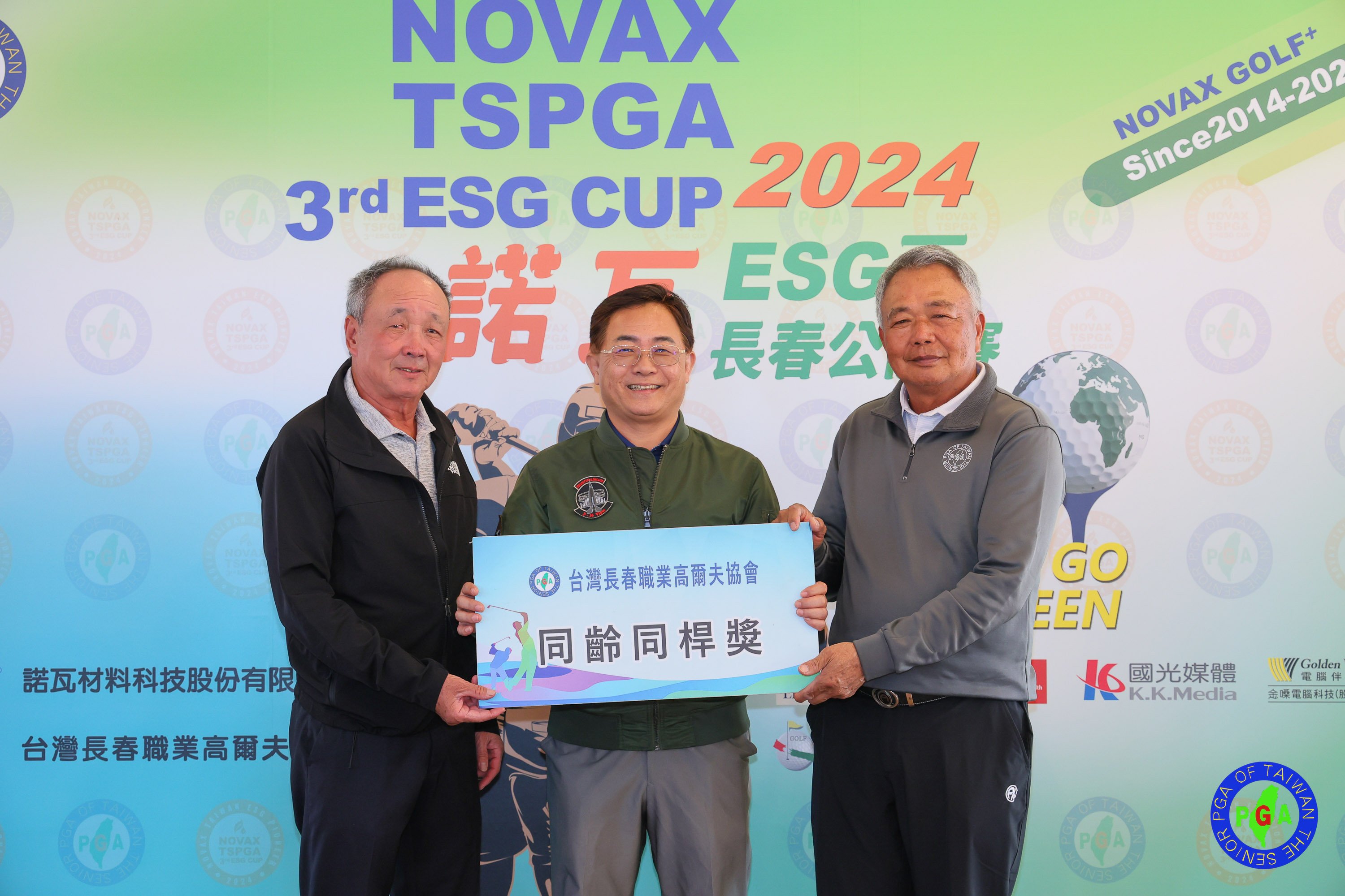 諾瓦材料科技公司董事長楊聯智(中)頒發同齡同桿獎給沈忠賢(右)及陳志明(TSPGA_葉勇宏攝)