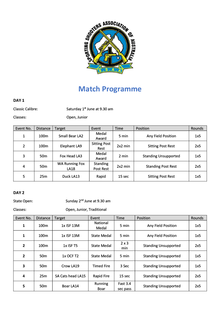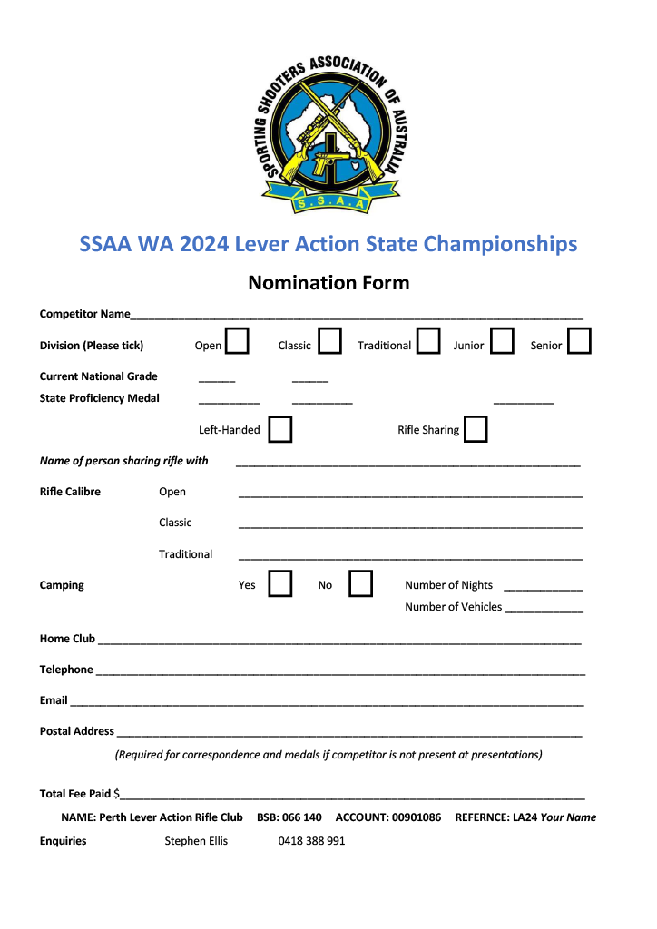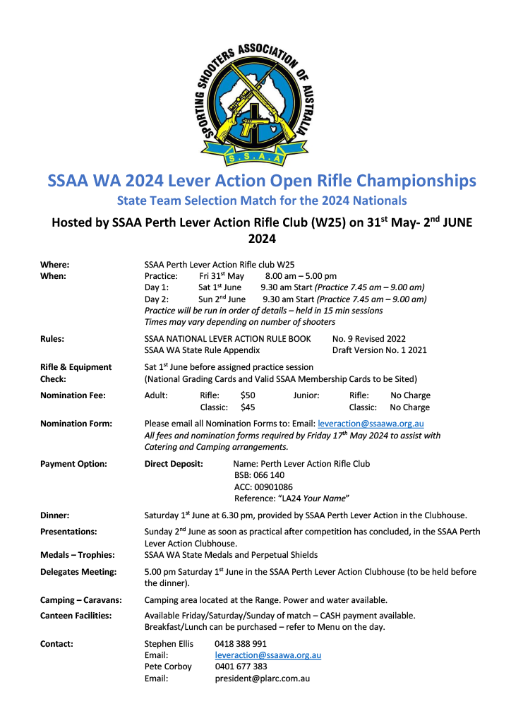 - BACK TO ALL NEWS SSAA WA 2024 Lever Action Open Rifle Championships Events, Safe Shooting - January 31, 2024 SSAA WA 2024 Lever Action Open Rifle Championships State Team Selection Match for the 2024 Nationals Hosted by SSAA Perth Lever Action Rifle Club (W25) on 31st May- 2nd JUNE 2024