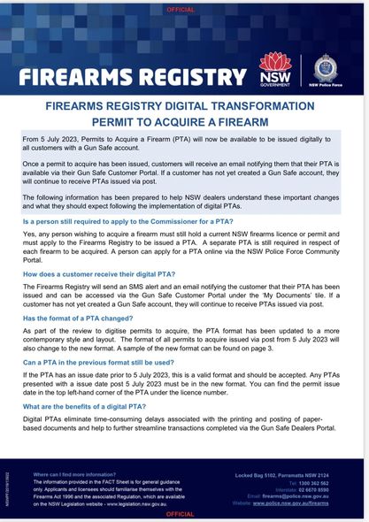 Please see the attached fact sheet from the NSW Firearms Registry that we have received.