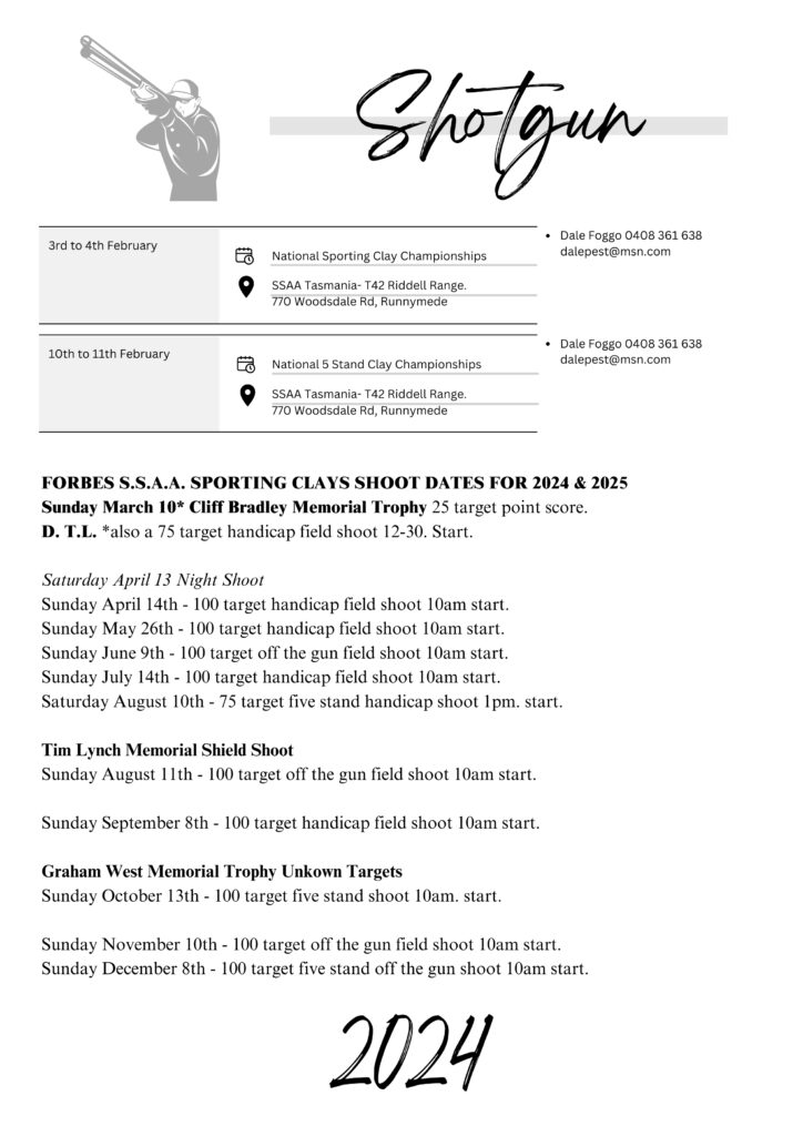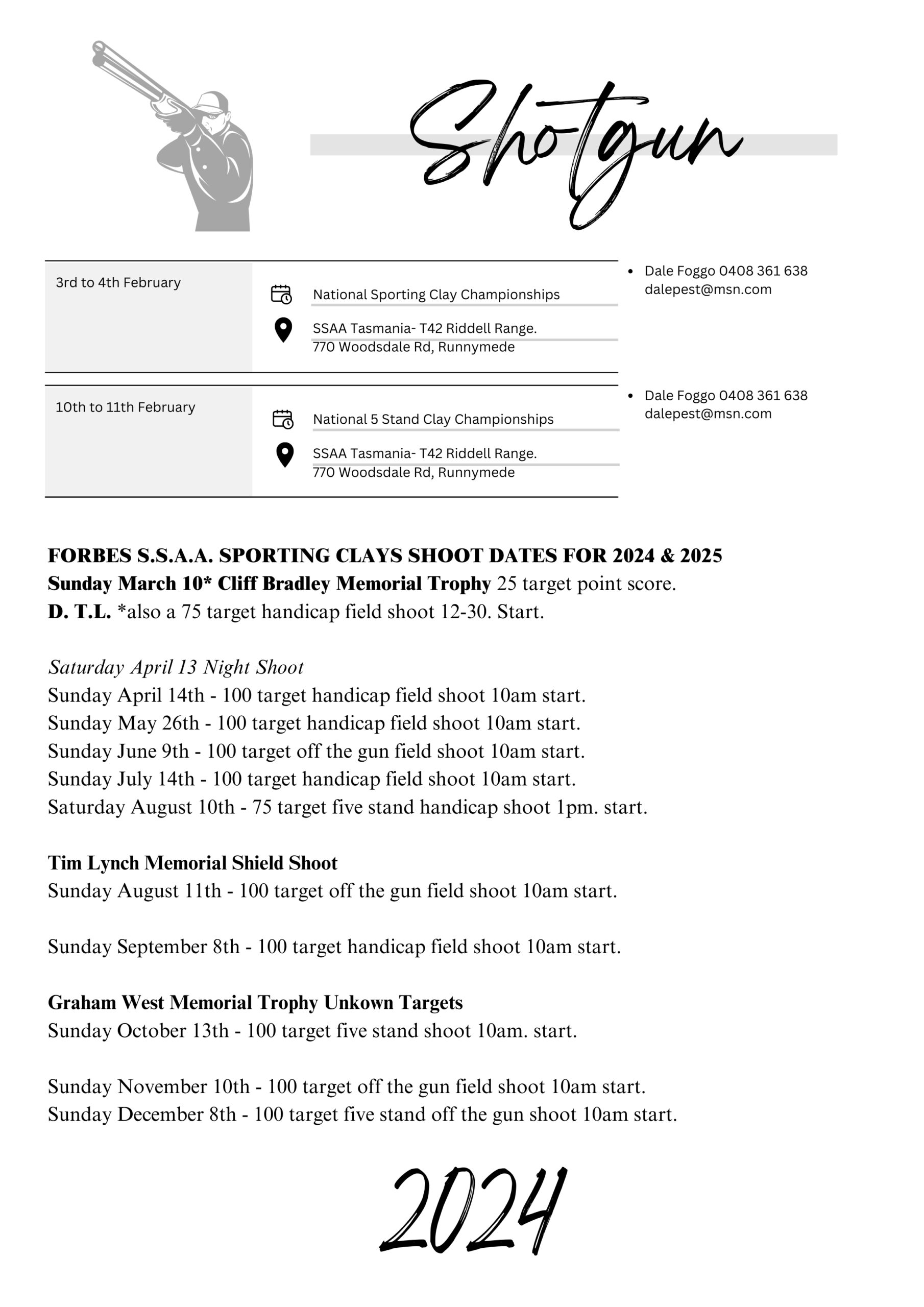 Shotgunning is one of the original SSAA disciplines with the original set of rules established in 1988. With the increasing popularity of Sporting Clays or Simulated Field events SSAA developed and adopted versions of 5-Stand and Sporting Clays to promote as SSAA matches. In January 2006 a new Shotgun Rule Book was approved with rules for these matches together with rules for High/Low Field Shotgun events.