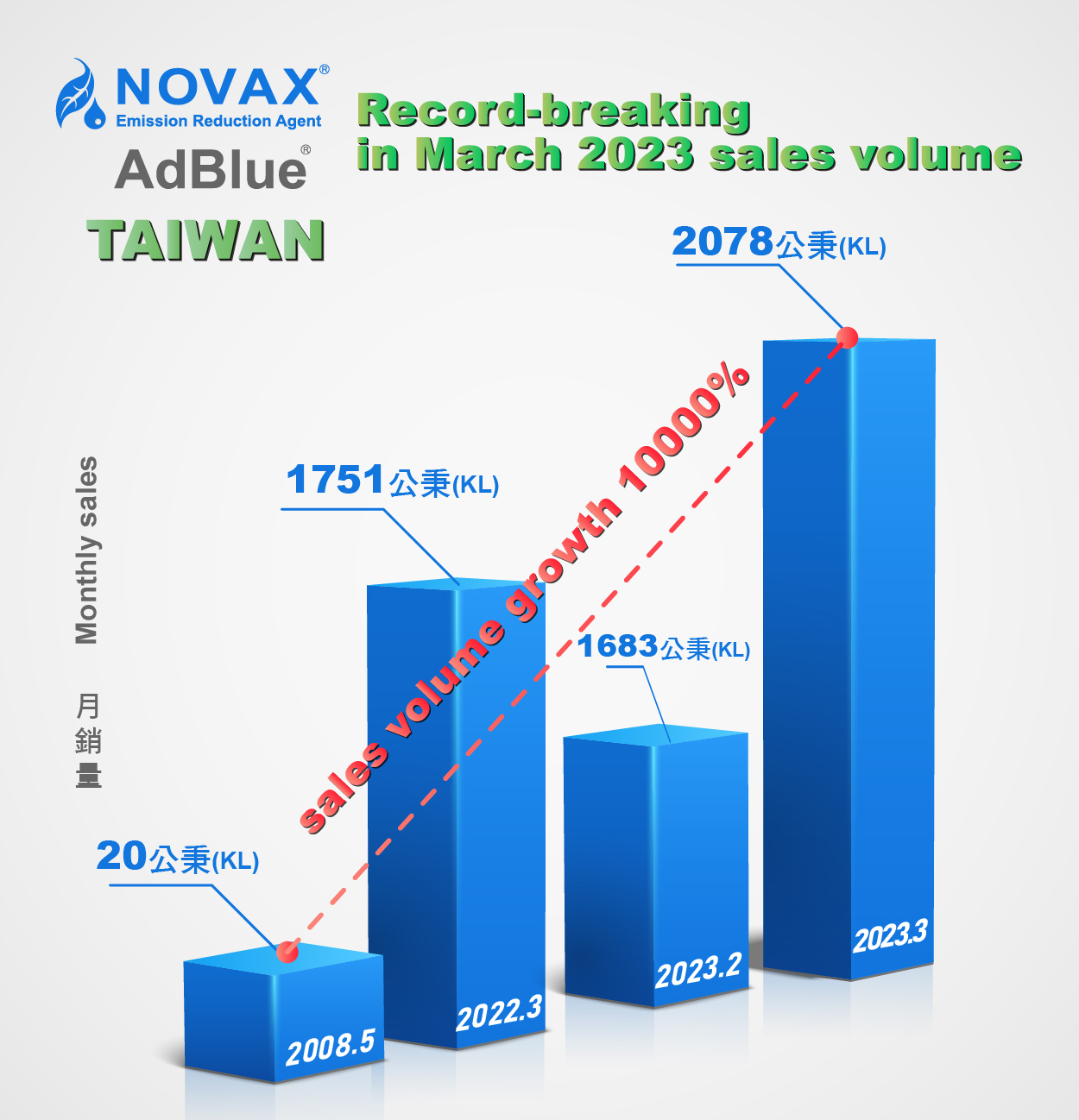 Although the global economy is slump, the expansion of global economy and trade has weakened, and the momentum of external demand is weak, domestic demand and consumption have continued to increase. In addition, after the unblocking of the epidemic in the construction, transportation, and tourism industries, market supply and demand have reversed sharply. The scale and speed of Taiwan's electronic technology factory construction continues, strengthening Taiwan's technology settlements and industrial strength, and also boosting regional construction and utilization. The working days in March is longer than other months, causing Taiwan's market to be cold outside and hot inside. After the epidemic, many industries such as tourist buses, dump trucks, combined vehicles, and heavy machinery have been greatly active, the sales of NOVAX® AdBlue® in Taiwan rose to 2,078 kiloliters, a new monthly high in the past year, an increase of 23% over the previous month, an increase of 18% over the same period last year, and a growth rate of 100 times compared with the initial establishment in March 2008.