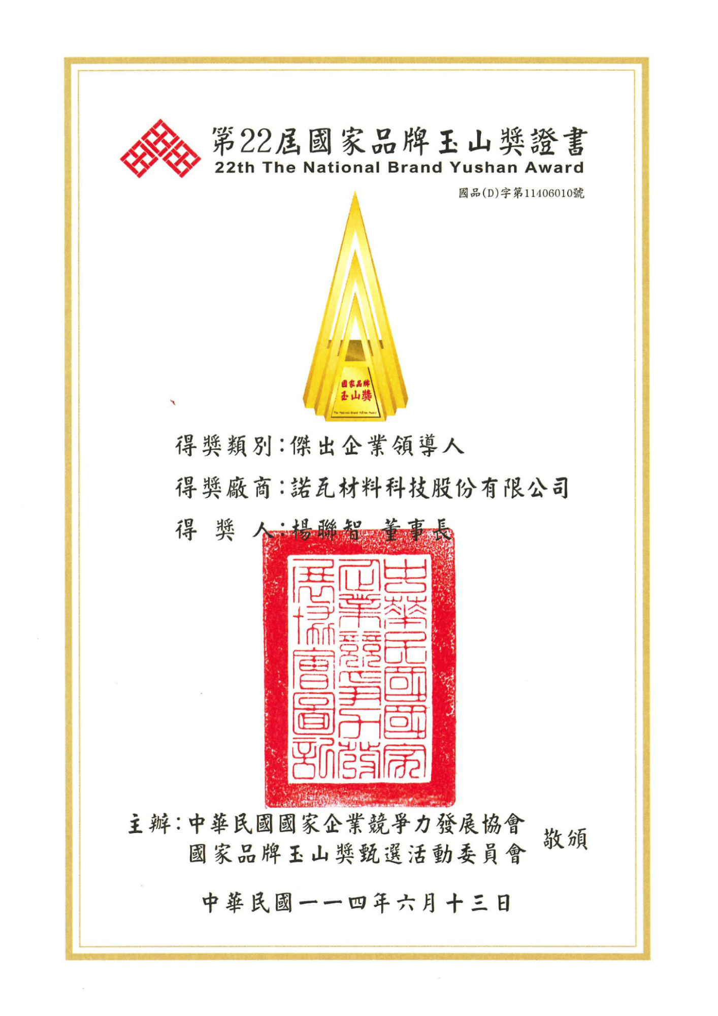 在變動的時代中堅守信念,在產業轉型浪潮中走出自己的路-本公司創辦人暨董事長楊聯智先生,榮獲2025年第22屆「國家品牌玉山獎-傑出企業領導人獎」,不僅彰顯卓越的領導遠見與實踐力,更象徵諾瓦材料科技長年深耕於商用車減排技術、為產業環保減碳提供解方,為地球重現藍天綠地的努力,成為台灣永續產業領域領頭羊,獲得國家級的高度肯定。
