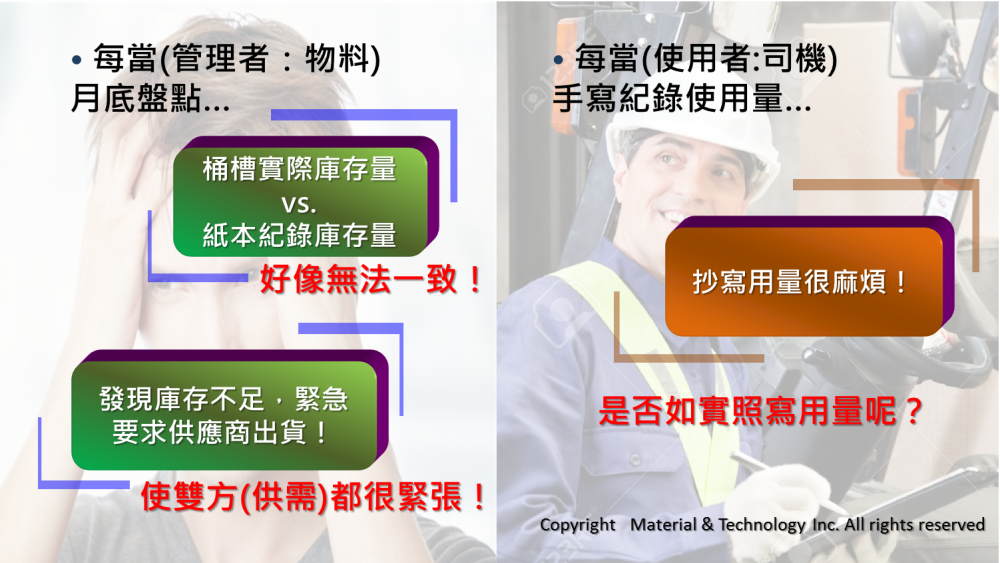 以往的加注系統,管理物料者及使用者,實際情況: