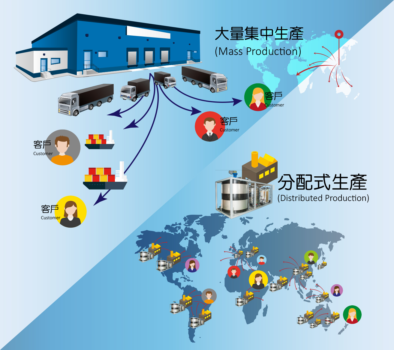 諾瓦材料根據觸媒還原劑(AdBlue®)的製程,創新發明高效能車用觸媒還原劑系統(英文名稱: i-Blending System)並申請專利認證。由於,諾瓦在台灣有優先進入市場的時間優勢,透過長時間在市場中的實際體驗與感受到客戶的需求改變,為了追求落實客戶及市場的需求,於是將原一般大量生產(Mass Production)的過程,變成分配式生產(Distributed Production),如下圖示。高效能觸媒還原劑生產系統縮小生產時所需要的空間與快速移動的優勢,因此能降低生產之相關成本,進而達到快速反應市場且獲取客源及利潤的目的。