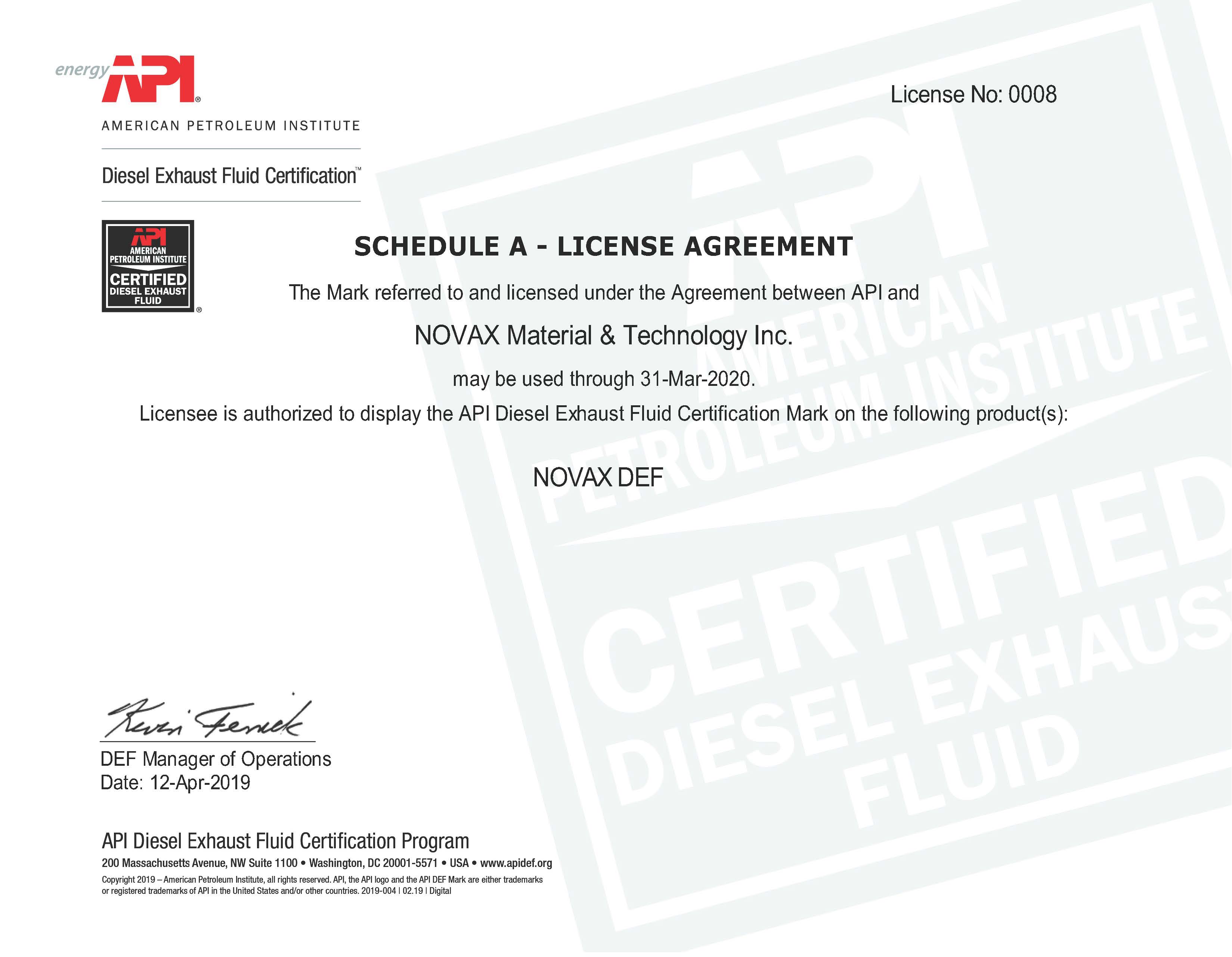 美國石油學會API認證 DEF Certificate NOVAX Material & Technology Inc. 2019-2020jpg