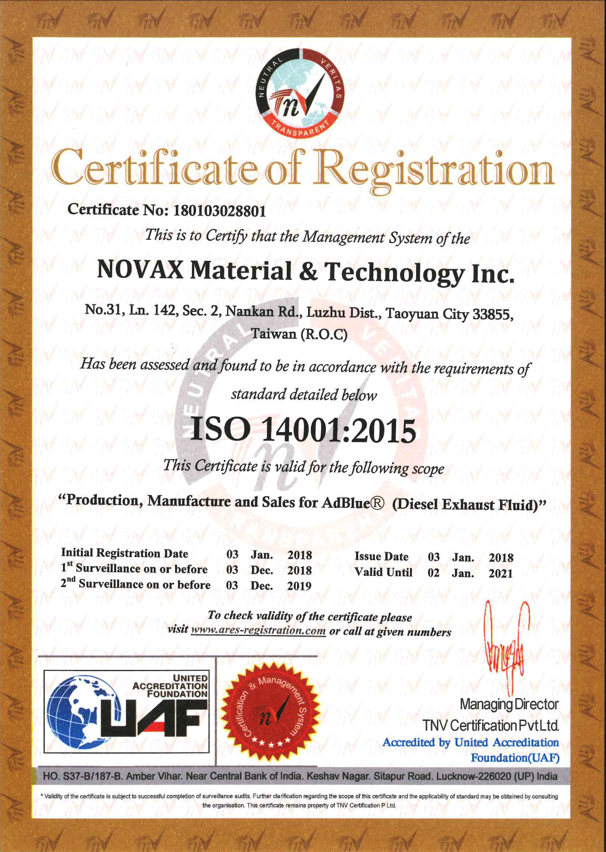 NOVAX ISO14001 Certificate 2018-2021jpg