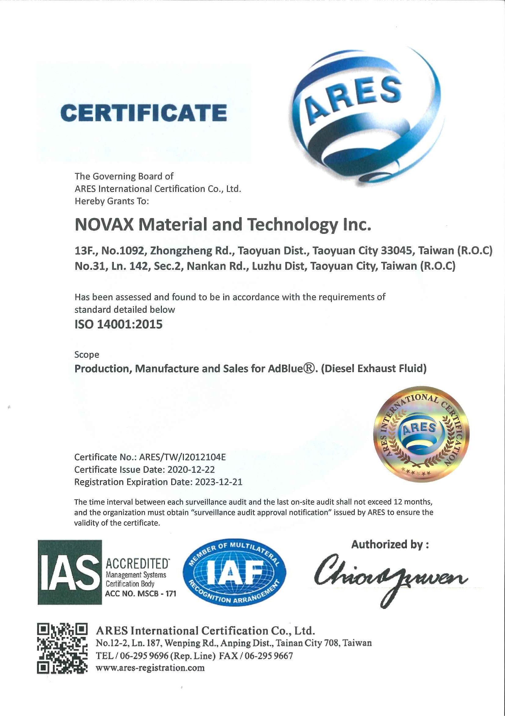 NOVAX ISO14001 Certificate 2020.12-2023.12jpg